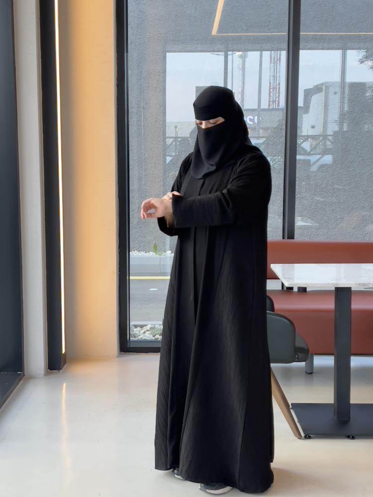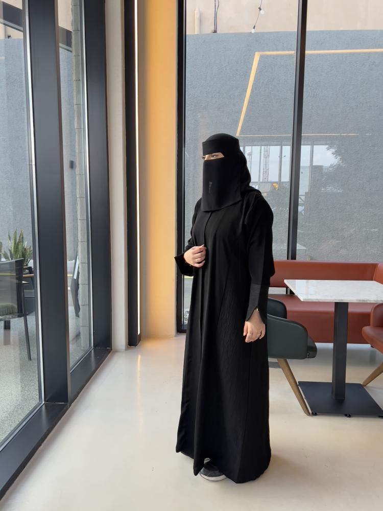 طول العباية يؤخذ من الكتف الى أسفل الكعبين (من الأمام)