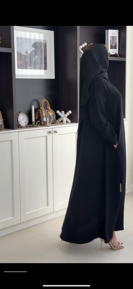 طول العباية يؤخذ من الكتف الى أسفل الكعبين (من الأمام)